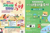 (포탈뉴스통신) 대전 동구는 오는 18일 구 대표 마을 축제인 ‘제4회 가양1동 봉이마을 가족사랑 한마당 축제’와 ‘제7회 대동 마을축제’를 잇따라 개최한다고 15일 밝혔다. 먼저, 가양1동 자생단체협의회(회장 오경진) 주관으로 얼리는 ‘제4회 봉이마을 가족사랑 한마당 축제’가 오전 11시부터 가양초 운동장에서 진행된다. 올해로 4회를 맞은 이번 축제는 주민 모두가 함께 즐기고 소통하는 지역 화합의 장으로 꾸며지며, 식전 풍물‧사물놀이 공연을 시작으로 ▲대전아트필하모닉오케스트라 금관 앙상블 ▲버블쇼 ▲댄스 및 색소폰 공연 ▲난타공연 등 다채로운 무대가 펼쳐진다. 또한, 주민이 직접 참여하는 가족 장기자랑과 제기차기·투호 결승전, 먹거리 장터, 도자기 공방, 아로마 체험 등 체험과 즐길거리가 어우러진 프로그램이 마련돼 온 가족이 함께 즐길 수 있다. 이어, 오후 1시부터는 대동성당 앞 대동천변에서 대동골목축제추진위원회(위원장 신영국) 주관으로 ‘제7회 대동 마을축제’가 열린다. ‘대동단결 주민 화합 한마당’을 주제로 진행되는 이번 축제는 개막식과 기념식을 시작으로 ▲대동 예라미합창단 및