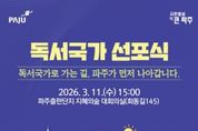 (포탈뉴스통신) 파주시는 오는 11일 15시, 파주출판도시 지혜의숲 대회의실에서 ‘파주시 독서국가 선포식’을 개최하고 책 읽는 도시를 넘어 ‘독서국가’로 나아가기 위한 힘찬 출발을 알린다. 이번 선포식은 지난 1월 국회의원관에서 열린 ‘독서국가 선포식 및 독서국가 추진위원회 출범식’의 취지에 발맞춰, 인공지능(AI) 시대에 대응하는 독서교육의 국가적 전환 움직임에 동참하고, 책과 도서관의 도시이자 출판산업의 중심지라는 도시의 강점을 바탕으로 시민과 함께하는 독서 생태계를 확대하기 위해 마련됐다. 이날 행사에는 도서관·교육·출판·서점 관계자와 시민 등 200여 명이 참석할 예정이며, ▲독서국가 선언문 발표 ▲대형 붓글씨 시연 ▲문단계의 아이돌이자 국회 독서국가 추진위원회 공동위원장인 박준 작가의 ‘읽는 하루’강연을 펼칠 예정이다. 파주시는 이번 선포식을 계기로 독서문화 확산 정책을 더욱 체계화해 시민 일상 속에 책 읽는 문화를 더욱 깊이 뿌리내리게 할 계획이다. 이번 행사는 시민 누구나 참여할 수 있으며, 참가 신청은 파주시도서관 누리집 또는 홍보물 내 정보 무늬(QR코드)를 이용하면 되고, 문의사항