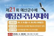 (포탈뉴스통신) 예산군은 오는 3월 28일 예당전국낚시대회장에서 ‘제21회 예산군수배 예당전국낚시대회’를 개최한다고 밝혔다. 군에 따르면 예당전국낚시대회는 전국의 낚시 동호인과 관광객이 함께 어우러지는 민물낚시대회로 국민의 레저 수요를 충족하고 지역경제 활성화에도 기여할 것으로 기대된다. 참가 신청은 3월 9일부터 3월 26일까지 선착순 500명을 대상으로 접수한다. 대회 참가를 희망하는 사람은 예당내수면어업계 누리집을 통해 신청할 수 있으며, 참가비는 1인당 5만 원이다. 대회 시상은 1위 트로피와 상금 500만 원, 2위 200만 원, 3위 100만 원이 수여되며, 이와 함께 여자우수상, 최대어상, 외래어종 퇴치상, 최고령상, 원거리상 등 다양한 특별상이 마련된다. 또한 시상 외에도 추첨을 통해 참가자들에게 다양한 경품이 제공될 예정이다. 이 밖에도 참가자 전원에게 중식을 제공하며 광시한우 구이 시식코너 등 다양한 부대행사도 함께 운영할 계획이다. 군 관계자는 “출렁다리와 모노레일, 예당호를 배경으로 한 무빙보트 수상체험 등 다양한 볼거리와 체험거리가 마련돼 있다”며 “