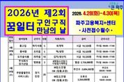 (포탈뉴스통신) 파주시는 오는 28일부터 30일까지 파주고용복지플러스센터(금촌동 엠에이치(MH)타워 8층)에서 2026년 제2회 ‘구인·구직 만남의 날’을 개최한다. 이번 행사는 지역 기업과 구직자 간 만남의 장을 마련해 실질적인 채용으로 이어질 수 있도록 지원하는 데 목적이 있다. 파주시 일자리센터는 현장에서 다양한 취업 정보를 제공하고, 참여 기업과의 현장 면접을 진행한다. 또한 이력서 지원 등 채용 대행 서비스도 함께 제공해 구직자들에게 보다 실질적인 취업 기회를 제공할 예정이다. 참여 기업들은 식품, 세탁업, 판매업, 물류 및 포장, 반도체 생산/검사, 도서 집책/검수, 전기·전자, 인쇄 등 다양한 분야에서 총 96명을 채용할 계획이다. 구직자는 사전 신청 후 이력서와 자기소개서를 준비해 원하는 기업의 면접에 응시할 수 있다. 이이구 민생경제과장은 “이번 행사는 지난 제1회 구인·구직 만남의 날을 통해 확인된 현장의 수요와 의견을 반영해 더욱 내실 있게 준비했다”라며 “앞으로도 지역 여건에 맞는 맞춤형 일자리 연계 행사를 지속적으로 추진하겠다”라고 밝혔다. 한편, 지난 2월 열린 2026년