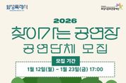 (포탈뉴스통신) (재)화성시문화관광재단은 1월 12일부터 1월 23일까지 ‘2026 찾아가는공연장’ 참여 공연단체를 모집한다고 밝혔다. ‘찾아가는 공연장’은 화성시의 곳곳에서 다양한 장르의 공연을 제공함으로써 시민들의 일상적인 문화예술 관람을 돕기 위한 사업으로, 2009년부터 시작된 화성시문화관광재단의 대표 문화사업 중 하나다. 지난 2025년도에는 공개 모집을 통해 40개의 공연단체를 선정했으며, 문화취약계층에 방문공연, 공원 광장 거리공연 등을 통해 다양한 장르의 공연으로 화성시민과 함께했다. ‘2026 찾아가는 공연장’은 약 140회차의 공연을 목표로 운영된다. 이번 공연단체 모집은 3년 이상의 공연활동 경력이 있는 공연단체라면 지역, 장르에 상관없이 신청가능하다. 접수는 1월 12일부터 23일까지 온라인으로만 가능하며, 1차 서류‧영상 심사, 2월 9일~10일 2차 실연‧면담 심사를 거쳐 2월 12일에 최종 선정단체 총 35팀을 발표할 예정이다. 화성시문화관광재단 안필연 대표이사는 “지역과 장르의 제한을 두지 않는 만큼, 화성시 곳곳에서 재능을 뽐내줄 다양한 예술 공연단체들의 많은 관심과 지원을 바란다