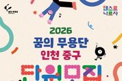 (포탈뉴스통신) (재)인천중구문화재단(이사장 김정헌)은 2026 꿈의 무용단 ‘인천 중구’의 신규 단원을 모집한다고 4일 밝혔다. ‘꿈의 무용단’은 문화체육관광부가 주최하고 한국문화예술교육진흥원이 주관하는 꿈의 예술단 사업으로, 인천중구문화재단은 4년 차 거점기관으로서 현대무용 기반의 무용예술교육을 안정적으로 운영해 오고 있다. 모집 대상은 인천 지역 거주 또는 소재 학교 재학 중인 아동·청소년(8세~18세)이며, 모집 기간은 2월 26일부터 3월 18일까지다. 중구·동구 거주자(또는 관내 학교 재학생)는 선발 시 우대한다. 이번 2026 꿈의 무용단 ‘인천 중구’는 현대무용 기반 문화예술교육을 통해 아동·청소년의 표현력과 공동체 역량을 키우는 성장형 프로그램이다. 무엇보다 과정 중심의 교육을 통해 참여 경험의 가치를 높이고자 한다. 재단은 온라인 접수 후 오디션을 통해 단원을 최종 선발할 방침이다. 선발된 단원은 4월부터 11월까지 정기 교육과정과 정기 공연에 참여하게 된다. 교육은 기초 신체 훈련과 움직임 탐색, 즉흥 활동, 레퍼토리 창작 등 단계별 프로그램으로 운영될 예정이다. &
