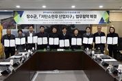 (포탈뉴스통신) 장수군은 27일 군청 2층 회의실에서 전북특별자치도 농생명산업지구로 지정된 ‘저탄소한우 산업지구’의 성공적인 조성과 활성화를 위해 관계기관‧단체와 업무협약(MOU)을 체결했다. 이날 협약식에는 최훈식 장수군수를 비롯해 장수한우지방공사, 전북대학교, 장수·장계농협, 무진장축협, 전국한우협회 장수군지부, 장수군유통사업단, ㈜이티바이오텍, ㈜복수 등 10개 기관·단체 대표가 참석해 협약기관 간 상호 업무체계를 구축했다. 이번 협약에 따라 장수군은 사업 총괄과 정책 지원을 담당하고 전북대학교·무진장축협·장수한우지방공사·㈜이티바이오텍은 저메탄 종축 및 사양관리 기술개발과 현장 실증을 추진한다. 또한 ㈜복수는 저탄소 기반 도축·가공 시스템을 구축하고 장수·장계농협과 장수군유통사업단은 ‘장수 저탄소 한우’ 브랜드 홍보와 판로 확대에 나선다. 여기에 전국한우협회 장수군지부는 생산자 조직으로서 농가 참여 확대와 현장 의견 수렴, 사업 확산을 위한 협력체계를 강화하고자 한다. 장수군은 이번 협약 참여기관 간 실무협의회를 구성해 데이터 공유와 탄소 감축 가이드라인 준수, 공동 마케팅 등을