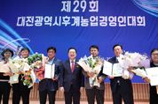 (포탈뉴스통신) 이장우 대전시장이 19일 대전시 농업기술센터에서 열린 제29회 한국후계농업경영인 대전시대회 개회식에서 대전 농업 발전에 기여한 공로로 한국후계농업경영인 대전시연합회로부터 감사패를 받았다. 이번 행사는 ㈔한국후계농업경영인 대전시연합회 주최로 열렸으며, 대전지역 농업인과 농협 관계자, 도시민 등 300여 명이 참석해 농업의 미래를 함께 논의하는 자리가 됐다. 이장우 대전시장은 수상 소감에서 “농업은 국가의 근간 산업으로 식량 안보와 생태계 보전에 중요한 역할을 하고 있다”라며 “과학수도 대전에 걸맞은 첨단기술을 활용해 스마트농업 기반을 조성하고 미래 농업의 성장 동력을 확보하는 데 최선을 다하겠다”라고 말했다. [뉴스출처 : 대전시]
