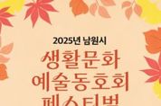 (포탈뉴스통신) 남원시가 후원하는 2025 남원시 생활문화예술동호회 페스티벌이 9월 28일에 남원 사랑의 광장에서 개최한다. 이 행사는 (사)남원시 생활문화예술동호회 네트워크에서 주관하는 축제로, 지역 예술인 및 생활 문화예술 동호인 500여 명과 남원 시민이 함께하는 남원의 생활 문화예술 축제이다. 오후 1시부터 오후 6시까지 남원 사랑의 광장 일원에서 진행되는 이번 축제는 18개 동호회의 음악·무용·농악 등 다양한 무대 공연이 펼쳐지고, 나만의 예술적 감각을 담은 생활용품을 제작해 볼 수 있는 전시 및 체험 부스가 마련됐다. 이기영 생활문화예술동호회 네트워크 이사장은 “이번 축제를 통해 남원 시민들이 함께 즐길 수 있는 다양한 프로그램이 마련됐다.”라며, “앞으로의 활동으로 시민 여러분이 즐거운 문화예술 활동에 참여할 수 있도록 노력하겠다.”라고 밝혔다. 최경식 남원시장은 “이번 행사를 통해 생활 문화예술인의 자긍심을 높이고, 시민 여러분이 생활 문화예술을 접할 수 있는 장이 될 것이다.”라며, “시민의 화합과 생활 문화예술 발전의 계기가 될 것이다.”라고 말했다. [뉴스출처 : 전라북도남원