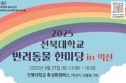 (포탈뉴스통신) 반려동물과 시민이 함께 즐기는 축제가 반려동물 친화관광도시 익산에서 열린다. 익산시는 '2025 전북대학교 반려동물 한마당'이 오는 27일 오후 1시 전북대학교 익산특성화캠퍼스에서 다채롭게 펼쳐진다고 22일 밝혔다. 이번 행사는 전북대학교 수의과대학이 주최하며, 반려인과 시민 모두가 즐길 수 있는 풍성한 볼거리와 체험거리를 선보인다. 행사장에서는 △멍냥 그립톡 만들기 △발도장 추억액자 △반려동물 건강검진 등 체험 부스가 운영된다. 또 반려동물 산책룩 펫션쇼와 OX 퀴즈, 사진 콘테스트 등 무대 프로그램이 마련돼 현장 열기를 더한다. 아울러 전북대 수의과대학 박철 교수와 윤지선 교수의 강연으로 유익한 정보를 전달하고, '일일 수의사 체험'을 통해 미래 수의사를 꿈꾸는 청소년들에게 특별한 진로 경험도 제공한다. 방문객들에게는 리유저블백, 텀블러, 부채 등으로 구성된 기념 선물이 주어진다. 이 밖에도 부스별 스탬프 투어와 이벤트 무대 프로그램을 통해 제공되는 펫 드라이기, 자동 급식기, 강아지 유모차, 카시트 등 푸짐한 경품도 현장의 즐거움을 더할 예