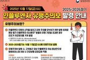 (포탈뉴스통신) 화순군은 질병관리청이 지난 17일 인플루엔자 유행주의보를 발령함에 따라, 호흡기 감염병 예방 수칙 준수 및 인플루엔자 예방접종을 당부했다고 23일 밝혔다. 질병관리청에 따르면 인플루엔자 의사환자 표본 감시 결과 의료기관에서 확인된 최근 4주간 의사환자 분율(외래환자 1,000명당)은 △38주 차 8.0명 △39주 차 9.0명 △40주 차 12.1명 △41주 차 14.5명으로 유행 기준(9.1명)을 이미 넘어섰으며, 지난해보다 약 2개월 이른 시점에 발령됐다. 연령대별로는 7~12세가 24.3명, 1~6세가 19.0명으로 나타나 전체 연령군 중 발생률이 가장 높았다. 유행주의보 발령 시 소아, 임신부, 65세 이상 고령자, 만성질환자 등 고위험군 대상 인플루엔자 의심 증상만으로 항바이러스제(타미플루캡슐 등, 리렌자로타디스크) 처방 시 건강보험 요양급여가 적용된다. 인플루엔자 바이러스는 독감을 일으키는 병원체로 주로 환자의 기침이나 콧물 등 호흡기 분비물을 통해 감염된다. 주요 증상은 고열, 기침, 인후통, 근육통 등의 증상을 동반하며, 특히 고령자·임신부, 만성질환자 등