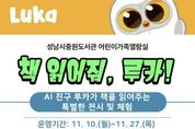 (포탈뉴스통신) 성남도시개발공사 중원도서관은 지역 어린이들에게 인공지능(AI) 기술을 활용한 새로운 독서 체험 기회를 제공하기 위해 ‘책 친구 로봇, 루카(LUKA)’를 오는 12월까지 운영한다고 21일 밝혔다. ‘루카’는 책 표지를 인식해 음성으로 내용을 읽어주는 인공지능 독서로봇으로, 유아와 어린이가 스스로 책을 읽고 들으며 독서의 즐거움을 느낄 수 있도록 돕는 AI 독서학습 보조기기다. 이번 사업은 루카를 활용한 전시와 기관 협력 프로그램을 통해 어린이들에게 친숙하고 흥미로운 독서 경험을 제공하고자 마련됐다. 먼저 중원도서관에서는 한 달간 ‘책 읽어줘! 루카’ 전시가 진행된다. 어린이·가족열람실에 루카와 전집을 함께 비치해, 어린이들이 직접 로봇을 체험하며 자연스럽게 책 읽는 즐거움과 호기심을 느낄 수 있도록 운영된다. 시민 누구나 자유롭게 참여 가능하며, AI 기술과 독서가 결합된 혁신적인 독서문화를 체험할 수 있는 특별한 기회를 제공한다. 또한, 도서관 밖에서도 아이들이 책과 만날 수 있도록 ‘책 나들이 ON 루카’ 협력 프로그램을 진행한다. 성남시 내