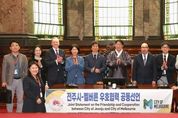 (포탈뉴스통신) 전주시와 호주의 대표도시인 멜버른시가 상호 발전을 응원하는 동반자가 되기로 했다. 우범기 전주시장이 이끄는 전주시 대표단은 현지시간으로 지난 10일 호주 멜버른 시청을 방문해 케빈 로웨이 멜버른 시의원과 오진관 주 멜버른 대한민국 총영사, 마크 코크레인 멜버른 국제협력실 국장, 멜버른 지역 언론사 등이 참석한 가운데 양 도시간 교류를 더욱 발전시키기로 뜻을 모았다. 특히 양 도시는 이 자리에서 우호적 국제관계를 맺는 공동선언에 나섰다. 이날 서명한 협력 체결서에는 △문화예술교류 활성화 △문화산업 및 관광·도시디자인 협력 △지속가능한 문화경제 발전 △공공·민간협력 네트워크 구축 등의 내용이 담겨 있다. 전주시와의 국제교류를 약속한 멜버른시는 호주 빅토리아주 기초자치단체 중 핵심이 되는 도시로, 호주 내에서도 가장 살고 싶은 도시로 선정된 바 있다. 우 시장을 비롯한 전주시 대표단과 멜번시 관계자들은 우호 협력 체결 이후 문화예술과 관광, 스포츠, 경제, 도시디자인, 교육 등 다양한 분야의 교류 확대 방안을 논의하기도 했다. 전주시 대표단은 멜버른시청 방문에