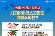 (포탈뉴스통신) 평택시는 최근 인도(서벵골주)에서의 니파바이러스 감염증 환자가 발생하여 해당 국가를 방문하는 시민들에게 감염 예방을 위한 각별한 주의를 당부했다. 니파바이러스 감염증은 1998년 말레이시아에서 처음 보고된 인수공통감염병으로, 인도(누적 환자 104명, 사망 72명), 방글라데시(누적 환자 343명, 사망 245명) 등 아시아 지역에서 산발적으로 발생했고 발열, 두통, 근육통 등으로 시작하여 의식 장애 등 신경계 증상으로 악화되는 것으로 알려져 있다. 또한 치명률은 40~75%에 이르고 현재 치료제 및 백신이 없으므로 감염 예방이 매우 중요하다. 발생 국가 여행 시에는 ▲과일박쥐나 아픈 돼지 등 동물과의 접촉 피하기 ▲생 대추야자수액 등 오염된 음료나 바닥에 떨어진 과일 섭취 금지 ▲환자의 혈액·체액 접촉 피하기 ▲30초 이상 손 씻기 ▲씻지 않은 손으로 눈, 코, 입 만지지 않기 등의 예방수칙을 철저히 준수해야 한다. 귀국 후 14일 이내에 의심 증상 발생 시 질병관리청 또는 관할 보건소로 신고해야 한다. 평택시 송탄보건소 관계자는 “니파바이러스 감염증은 사망률이 높지만 개인 위생수칙을 철저히