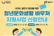(포탈뉴스통신) 광진구가 취업을 준비 중이거나 사회에 첫발을 내딛은 청년들의 여가 활동을 지원하기 위해 ‘청년문화생활바우처 지원사업’을 본격 추진한다. 지난해 첫 실시된 청년문화생활바우처 지원은 지역 내 청년들이 공연 및 영화 관람, 미술, 음악, 스포츠 활동 등 다양한 문화적 경험을 할 수 있도록 돕는 사업이다. 지원 대상은 광진구에 1년 이상 연속해 거주 중이며, 가구 기준중위소득 120% 이하인 24세~29세 청년이다. 상·하반기 1·2차에 걸쳐 각 250명씩 선발해 총 500명에게 1인당 10만 원의 문화생활비를 바우처 카드로 지급한다. 1차 신청은 2월 1일부터 15일까지 광진구청 누리집에서 온라인으로 진행한다. 구는 청년들의 문화 향유권을 증진하는 동시에 지역 문화·여가 산업과 상생하기 위해 바우처 사용처인 가맹점을 연중 모집한다. 카드 결제 시스템을 갖춘 ▲문화예술시설(미술·음악·연극 등) ▲건강체육시설(체육관·수영장·체육용품점 등) ▲진로개발·취미활동시설(공방·체험·기술교육 등) ▲공유시설(스터디카페·공유사무실 등)을 비롯해 관내 문화·여가 관련 모든 업종 사업장이 참여 가능하다. &