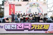 (포탈뉴스통신) 제10회 예천전국가요제가 2일 오후 2시,‘2025 예천활축제&농산물축제’ 특설무대에서 열렸다. (사)한국연예예술인총연합회예천지회(지회장 채희삼)의 주관으로 진행되는 이번 대회에는 전국에서 엄선된 본선 12팀이 출연하여 열띤 경연을 펼쳤다. 예천전국가요제는 지역 문화예술 발전과 대중음악 활성화를 위해 꾸준히 이어져 온 행사로 예천색소폰동호회의 식전공연을 시작으로 본선 진출자 12팀과 강민주, 통일메아리악단, 인댄스 무용단 등의 초청공연이 펼쳐졌다. 시상식에서는 400만 원의 상금이 걸린 대상은 문정옥 씨(대구) 금상은 유소라 씨(충주)가 수상했으며, 은상은 장혜진 씨(문경), 동상은 강나은 씨(서울), 가창상은 김정희 씨(영주), 인기상은 최우혁 씨(대구)에게 각각 수여됐다. 수상자들에게는 수상의 영예와 함께 많은 격려가 전해졌다. 김학동 군수는 “지역문화 활성화와 주민 화합의 장을 마련해 가고 전국가요제가 더욱 발전하여 예천을 대표하는 문화예술축제로 자리매김하기를 바란다”고 전했다. [뉴스출처 : 경상북도예천군]
