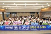 (포탈뉴스통신) 재단법인 해남군교육재단(이사장 명현관)은 지난 28일 해남군청 대회의실에서 2025년 해남군 장학생 장학증서 수여식을 가졌다. 수여식에서는 2025년 각 분야 해남군 장학생으로 선발된 우수학생 474명에게 총 4억 5,500만원의 장학금을 지원한다. 이날 수여식에는 장학생 대표 78명과 관계자들이 참석하여 자리를 빛냈다. 식전 공연으로 예체능 분야 장학생으로 선발된 한국무용창작팀과 태권도 시범팀이 수준 높은 공연을 선보이기도 했다. 2025년도 장학금 대상자는 성적우수 장학생 75명, 기능영재 장학생 30명, 희망장학생 71명, 예체능, 과학 등 특기자 장학생 117명, 기타 장학생 10명 등이다. 특히 초등학력인정학교 만학도 23명에게 배움의 도전을 응원하는 장학금과 타지역 전학, 지역사회공헌, 농어업인 육성, 꿈드림 등 50명에게도 맞춤형 장학금이 지원됐다. 대학생 98명에게도 생활지원금 성격의 장학금이 지원됐다. 이날 수여식에서 명현관 군수는“장학금은 여러분의 꿈과 열정을 해남군민 모두가 응원하는 증표”라며“학생들이 경제적 걱정없이 학업에 전념하여 해남의 미래를 이