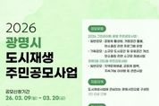 (포탈뉴스통신) 광명시가 오는 20일까지 주민이 스스로 마을 문제를 해결하고 공동체 활성화를 이끌어갈 ‘2026년 도시재생 주민공모사업’ 참여단체를 모집한다. 이번 공모사업은 광명시 전역을 대상으로 하는 ‘그린라이트 광명 주민공모사업’과 광명3동 더드림 도시재생활성화지역을 대상으로 하는 ‘광명3동 더드림 주민공모사업’ 두 가지 유형으로 운영한다. ‘그린라이트 광명 주민공모사업’은 일반공모 2팀과 기획공모 1팀을 선정해 공동체 활성화, 탄소중립 프로그램 운영, 소규모 도시공간 개선 등 주민 아이디어를 사업으로 발전시키는 활동을 지원한다. 일반공모팀은 팀당 최대 500만 원, 기획공모팀은 팀당 최대 1천만 원을 지원한다. ‘광명3동 더드림 주민공모사업’은 광명3동 도시재생 활성화지역의 마을 문제 해결과 공동체 협력 프로그램 등을 주제로 공모를 진행한다. 4팀을 선정하며 팀당 최대 500만 원을 지원한다. 시는 주민공모사업 이해를 돕기 위해 오는 12일 오후 3시 광명3동 어울리기 문화발전소(광명동 126-31)에서 사업설명회를 개최한다. 또한 사업 성과 확산을 위해 사전 컨설팅