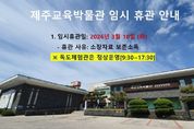 (포탈뉴스통신) 제주도교육청 제주교육박물관은 10일 소장자료의 안전한 보존과 쾌적한 관람 환경 조성을 위해 임시 휴관을 실시한다. 박물관은 소중한 교육 자료의 훼손을 방지하고자 매년 두 차례 문화재 전문 약제를 활용한 보존 소독을 진행하고 있다. 이번 소독 대상은 수장고와 전시실에 보관된 약 3만 9000여 건의 자료를 비롯해 야외전시장과 초가집 전체를 포함한다. 소독 작업이 진행되는 10일 당일에는 전시실 및 야외전시장 초가집 관람이 제한된다. 다만 관리동에 위치한 독도체험관은 평소와 같이 정상적으로 관람할 수 있다. 제주교육박물관 관계자는 “소중한 교육 유산을 보존하고 관람객에게 더욱 안전한 환경을 제공하기 위한 필수적인 조치인 만큼, 임시 휴관에 따른 관람객들의 넓은 양해를 부탁드린다”고 말했다. [뉴스출처 : 제주도교육청]