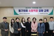(포탈뉴스통신) 인천 동구의회는 지난 19일 의회 세미나실에서 구의원과 의회사무과 공무원을 대상으로 소통 역량 강화 교육을 실시했다. 이번 교육은 이미지 컨설팅 및 커뮤니케이션 교육 전문강사인 김미선 강사를 초빙해 ‘언어적·비언어적 커뮤니케이션 능력의 활용 및 전략 수립’을 주제로 강의가 진행됐다. 김미선 강사는 이날 갈등 상황에서의 대화 기술과 정책 설명 시 설득력을 높이는 언어적 소통 기법을 소개했다. 아울러 의정활동 과정에서 주민에게 신뢰를 줄 수 있는 이미지 등 비언어적 소통 기법의 중요성도 강조했다. 또한 의원 개인별 이미지에 적합한 표정, 자세, 외형 등 다양한 전략을 제시하며 주민과의 긍정적 첫인상을 형성하고 소통의 신뢰도를 높일 수 있는 실질적인 방법을 안내했다. 유옥분 의장은 “의정활동에서의 소통 능력은 정책 메시지를 효과적으로 전달하는 중요한 역량”이라며, “이번 교육이 의원들이 주민과의 소통에서 신뢰를 구축하고, 의정활동을 보다 원활하게 수행하는 데 큰 도움이 될 것”이라고 말했다. [뉴스출처 : 동구의회]
