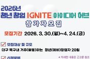 (포탈뉴스통신) 대구 북구청은 지역 청년들의 창업 열정과 혁신적인 아이디어 발굴을 지원하기 위해 오는 4월 24일까지 '청년 창업 Ignite 아이디어 허브' 참가자 20팀을 모집한다. 이번 사업은 지역 청년 (예비)창업자들이 보유한 창업 아이디어에 ‘점화(Ignite)’의 계기를 제공하여 사업화 가능성을 구체화하고 현실화할 수 있도록 단계별로 지원할 예정이다. 참가 대상은 2026년 청년놀이터 멤버십 회원 또는 창업놀이터 입주기업, 현재 39세 이하(1986년 3월 31일 이후 출생)인 북구 지역 청년 (예비)창업자이다. 북구 거주자․북구 소재 기업 재직자․북구 소재 대학생(휴학생)․북구 관내 창업 3년 미만 기업 중 1개 이상 요건을 충족하면 참가할 수 있으며, 이메일로 신청하면 된다. 선발된 팀에는 월 2회 이상의 협업 공간 이용 지원, 팀당 활동비 50만 원이 지원되며, 성과발표회를 통해 상위 7팀에는 총 310만 원 규모의 시상금이 수여될 예정이다. 배광식 북구청장은 “청년이 가진 아이디어 하나가 미래를 밝히는 불꽃이 될 수 있도록 지속적으로 청년이 도전할 기회를 제공하고 대구 북구를 청년