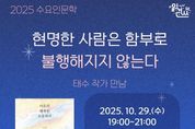 (포탈뉴스통신) 인천광역시교육청서구도서관은 10월 29일 오후 7시부터 9시까지 『어른의 행복은 조용하다』의 저자 태수 작가를 초청해 ‘수요인문학’ 강연 ‘현명한 사람은 함부로 불행해지지 않는다’를 진행한다. ‘수요인문학’은 서구도서관이 2020년부터 운영해온 대표 인문학 프로그램으로, 올해 하반기부터는 대면과 비대면 방식을 병행해 운영되고 있다. 이번 강연은 함께읽기 프로그램과 연계해 도서관 1층 북카페에서 진행되며, 태수 작가가 일상 속 작은 행복과 마음의 균형을 주제로 강연한다. 참가 신청은 10월 17일 오전 10시부터 가능하며, 자세한 사항은 서구도서관 누리집 또는 독서문화과로 문의하면 된다. [뉴스출처 : 인천시교육청]