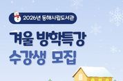 (포탈뉴스통신) 동해시는 2026년 겨울방학을 맞아 관내 초등학생을 대상으로 동해시립도서관에서 겨울방학 특강 프로그램을 운영한다고 밝혔다. 이번 특강은 1월 19일부터 1월 23일까지 발한도서관, 북삼도서관, 꿈빛마루도서관에서 운영되며 북트레일러 크리에이터, 뚝딱! 과학 탐험대, 겨울나라 도자기 공방 등 총 6개 과정, 66명을 모집할 계획이다. 접수는 1월 6일 오전 10시부터 동해시립도서관 홈페이지를 통해 선착순으로 진행되며, 신청은 홈페이지 내 독서문화 → 프로그램 신청 메뉴를 통해 가능하다. 김은서 평생학습과장은 “이번 겨울방학특강을 통해 지역 어린이·청소년들이 다양한 창작·독서 체험을 경험함으로써 창의력과 사회성 향상에 도움이 될 것”이라고 말했다. 재료비를 제외한 수강료는 무료이며, 세부 내용은 동해시립도서관 홈페이지에서 확인할 수 있다. 기타 문의사항은 발한도서관, 북삼도서관, 꿈빛마루도서관으로 문의하면 된다. [뉴스출처 : 강원도동해시]