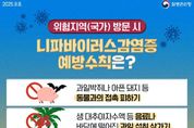 (포탈뉴스통신) 전라남도는 설 연휴기간 해외 여행객 증가가 예상됨에 따라 최근 인도 등 일부 국가에서 발생한 ‘니파바이러스감염증(Nipah virus infection)’에 대해 각별한 주의를 당부했다. 니파바이러스감염증은 치명률이 40~75%에 달하는 고위험 감염병으로, 지난해 9월 제1급 법정감염병으로 신규 지정됐다. 지난 1월 인도에서 2명, 방글라데시에서 1명이 발생했으며, 현재까지 국내 감염 보고사례는 없다. 인수공통감염병으로 주된 감염경로는 과일박쥐, 돼지 등 감염된 동물과의 접촉, 생 대추야자수액과 같은 오염된 식품 섭취, 환자의 체액과 밀접 접촉 등이다. 감염 초기에는 발열, 두통, 근육통 등 일반적 증상이 나타나지만, 중증으로 진행되면 뇌염, 의식 저하 등 심각한 신경계 증상을 동반할 수 있다. 현재까지 백신이나 치료제가 없어 ▲(야생)동물과의 접촉 피하기 ▲오염된 음료나 식품 섭취 금지 ▲환자와 직접 접촉 피하기 ▲자주 손씻기와 같은 개인위생 철저 등 예방수칙 준수가 필요하다. 또한 인도·방글라데시 등 니파바이러스 발생 국가를 방문한 후 귀국 14일 이내