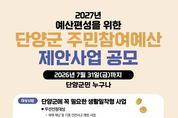(포탈뉴스통신) 단양군은 군민이 예산편성 과정에 직접 참여해 지역에 꼭 필요한 사업을 제안할 수 있도록 ‘2027년 예산편성을 위한 주민참여예산 제안사업 공모’를 실시한다고 밝혔다. 이번 공모는 오는 7월 31일까지 진행되며, 단양군민은 물론 단양군 소재 직장·단체·학교에 소속된 사람이면 누구나 참여할 수 있다. 참여를 희망하는 주민은 주민e참여 홈페이지를 통해 온라인으로 접수하거나, 우편 또는 단양군청 예산팀, 가까운 읍·면사무소를 방문해 제안서를 제출하면 된다. 제안 대상은 단양군에 꼭 필요한 주민 체감형 사업 전반이다. 특히 재해·재난 및 각종 안전사고 예방과 관련된 사업은 우선 검토 대상으로 반영해 군민 안전과 직결되는 사업이 적극 추진될 수 있도록 할 계획이다. 다만 ▲국가사무 ▲사전절차 이행이 필요한 대규모 투자사업 ▲이미 시행 중이거나 유사·중복되는 사업 ▲민간보조사업 ▲특정 단체·지역·개인을 위한 사업 ▲연례적·반복적인 필수경비 및 일회성 행사 ▲소규모 주민숙원사업 등은 공모 대상에서 제외된다. 이번 공모는 군민의 다양한 의견을 군정에 반영하고, 일상에서 체감