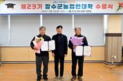 (포탈뉴스통신) 장수군은 2일 장수군농업기술센터에서 최훈식 장수군수와 최한주 군의회 의장, 수료생 80여 명이 참석한 가운데 ‘제23기 장수군 농업인대학 수료식’을 개최했다고 밝혔다. 올해 장수군 농업인대학은 지난 3월에 개강해 11월까지 농업인의 전문능력 향상을 위해 사과·두릅·지속가능한 치유농업 등 총 3개 과정을 편성해 교육생 132명을 대상으로 진행했다. 교육은 이론 수업과 현장 실습을 병행한 총 37회, 175시간의 체계적인 프로그램으로 구성됐으며, 이를 통해 장수농업을 선도할 수 있는 87명의 수료생을 배출했다. 수료식에서는 올해 교육 운영 과정에서 자치활동에 공로가 큰 백승덕 교육생에게 공로상이 수여됐으며, 김연수·김형중 교육생이 전 과정을 우수한 성적으로 이수해 우수상을 받았다. 다양한 지역 농업인들이 함께 참여한 본 과정은 단순한 기술 습득을 넘어 농업경영 역량을 강화하는 데 실질적 도움이 된 것으로 평가되고 있다 수료생들은 “농업인대학에서 배운 지식과 경험을 현업에 적용해 고품질 농산물 재배와 효율적인 경영관리로 소득을 높이는데 도움이 되는 유익한 시간이었다”고 소감을