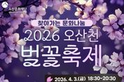 (포탈뉴스통신) 오산문화재단은 오는 4월 3일 오후 6시 30분 오산천 야외무대(종합운동장 뒤편)에서 시민들과 함께하는 봄맞이 ‘2026 오산천 벚꽃 축제’를 개최한다. 이번 행사는 따뜻한 봄의 시작을 알리며 시민들에게 특별한 추억을 선사하기 위해 마련된 것으로, 가수 황민호의 축하 공연을 비롯해 점등식과 폭죽 퍼포먼스가 어우러져 오산천 일대를 화려한 봄밤의 분위기로 물들일 예정이다. 행사 당일에는 음악과 빛, 불꽃이 조화를 이루는 다양한 프로그램이 진행되며, 남녀노소 누구나 함께 즐길 수 있는 열린 문화행사로 시민들의 큰 호응이 기대된다. 오산문화재단 관계자는 “오산천에서 펼쳐지는 이번 축제가 시민들에게 특별한 봄밤의 추억으로 남길 바란다”며 “앞으로도 시민들이 일상 가까이에서 문화와 예술을 향유할 수 있도록 다양한 프로그램을 지속적으로 마련하겠다”고 밝혔다. [뉴스출처 : 경기도 오산시]