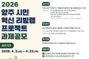 (포탈뉴스통신) 양주시가 시민이 일상에서 겪는 사회문제를 직접 발굴하고 해결 방안을 모색하는 ‘2026년 양주 시민 혁신 리빙랩 프로젝트’ 공모를 오는 23일까지 진행한다. 이번 공모는 시민 참여를 기반으로 지역사회 문제 해결 방안을 도출하기 위해 마련됐다. 양주시에 거주하거나 직장·학교 등 생활권을 둔 시민이면 누구나 참여할 수 있다. 참여는 주제안자를 포함한 4인 이상으로 구성된 팀 단위로 가능하며, 공감토크(현장심사)와 과제 선정 이후 진행되는 워크숍, 성과공유회(12월 예정) 등에 참여해야 한다. 공모 주제는 청소년·청년, 탄소중립, 도시재생, 1인 가구, 반려동물 문화, 디지털 격차 등 지역사회가 직면한 다양한 사회문제 해결과 관련된 아이디어다. 접수된 제안은 사회적 가치와 효과성·창의성, 실현 가능성 등을 기준으로 제안심사실무위원회 심사와 공감토크 현장심사를 거쳐 최종 과제로 선정된다. 최종 선정된 2개 팀은 5월부터 11월까지 약 7개월간 퍼실리테이터(활동촉진자)와 함께 워크숍에 참여하며, 문제 정의부터 개선 방향 도출, 시범사업 추진까지 단계별 프로젝트를 수행하게 된다.