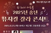 (포탈뉴스통신) 대전 서구가 한 해를 마무리하고 새해를 맞는 무대를 선사한다. 서구는 오는 12월 23일 구청 2층 구봉산홀에서 ‘2025년 송년 뮤지컬 갈라 콘서트’를 개최한다고 10일 전했다. 공연은 90분간 진행되며 뮤지컬 배우 이건명과 라움앙상블이 출연한다. ‘맘마미아’ 메들리와 ‘영웅’ 등 대중적 인지도가 높은 작품을 비롯해, 캐롤 메들리 등 연말 분위기를 담은 무대가 선보인다. 이달 22일까지 서구청 홈페이지의 [구민참여] 게시판 [통합예약시스템]에서 예약받는다. 추가적인 사항은 서구 문화체육과로 문의하면 된다. 서구 관계자는 “올 한 해 구민 여러분이 서구에 보내주신 사랑과 관심에 감사드린다”며 “앞으로도 구민들의 문화 향유 기회 확대를 위해 지속적으로 노력하겠다 ”고 전했다. [뉴스출처 : 대전시 서구]