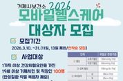 (포탈뉴스통신) 거제시보건소는 오는 3월 10일부터 모바일 헬스케어사업에 참여할 시민 100명(선착순)을 모집한다. 모바일 헬스케어사업은 1개 이상의 건강위험요인이 있는 19세 이상의 거제시민을 대상으로 약 24주~27주간 모바일 앱을 활용하여 간호사, 영양사, 운동전문가 등 보건소 전문인력이 맞춤형 건강관리 서비스를 제공하는 사업이다. 참여자는 개인별 건강상태에 맞춘 체계적인 관리와 상담을 받을 수 있다. 단, 고혈압 당뇨 등 만성질환을 진단받았거나 현재 약물을 복용중인 사람은 제외된다. 선정된 대상자는 거제시보건소를 방문해 총 2~3회(최초 · 중간 · 최종검사)의 신체계측 및 혈액검사를 받게 되며, 모바일 앱을 활용한 비대면 맞춤형 건강상담을 제공받는다. 또한 모바일을 통해 건강, 영양, 운동 등 건강컨텐츠 및 비대면홈트레이닝 프로그램을 제공할 예정으로 개인 일상 중 시간에 구애받지 않고 건강관리에 도움을 받을 수 있다. 모집 기간은 2026년 3월 10일부터 3월 31일까지이며, 신청은 거제시 공식 SNS을 통한 네이버폼(QR코드)으로 가능하다. 모바일
