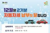(포탈뉴스통신) 연수구는 자동차 등 약 12만 4천 대를 대상으로 2025년 12월 정기분 자동차세 184억 원을 부과했다. 이번에 부과된 자동차세는 12월 1일 현재 연수구에 등록된 자동차, 125cc 초과 이륜차, 건설기계의 등록원부상 소유자에게 부과되며, 연간 자동차세를 한꺼번에 미리 납부(1·3·6·9월)한 차량은 과세 대상에서 제외된다. 납부 기한은 이달 31일까지이며, 전국 금융기관의 현금자동입출금기, 금융결제원, 위택스, 자동응답시스템, 앱 등을 통해 계좌이체나 신용카드로 낼 수 있다. 자동차세 관련 자세한 사항은 연수구 세무과 자동차세팀으로 문의하면 된다. 연수구 관계자는 “납부 기한이 지나면 3%의 납부지연가산세가 부과되고, 번호판 영치 등 불이익이 발생할 수 있는 만큼 기한 내 납부해 주시기를 바란다.”라고 당부했다. [뉴스출처 : 인천시연수구]