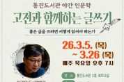 (포탈뉴스통신) 김포시 통진도서관은 고전 중심의 독서법과 글쓰기를 알려주는 야간 인문학 프로그램 ‘고전과 함께하는 글쓰기’를 오는 3월 5일부터 3월 26일까지 매주 목요일 오후 7시에 통진도서관 세미나실에서 운영한다고 밝혔다. '고전 한 책 깊이 읽기'의 저자 이권우는 ‘고전과 함께하는 글쓰기’를 통해 맹자의 철학과 중용을 깊이 있게 다루며, 책을 읽으면서 생각을 확장하는 독서법과 단락 중심의 글을 쓰는 방법을 총 4회차에 걸쳐 진행한다. 회차별 주제는 ▲고전 속 맹자의 철학 ▲맹자가 알려주는 우리 시대의 관계성 ▲글쓰기가 쉬워지는 독서법 ▲글쓰기의 첫걸음이다. 참여를 원하는 경우 오는 2월 10일 오전 10시부터 통진도서관 누리집 또는 전화로 신청할 수 있으며, 고전과 글쓰기에 관심있는 성인 20명을 선착순으로 모집한다. [뉴스출처 : 경기도 김포시]