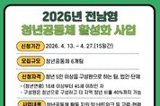 (포탈뉴스통신) 영광군은 청년들의 지역 활동 기반을 마련하고 지역사회 활동 주체로 성장할 수 있도록 지원하기 위해 오는 4월 27일까지 ‘2026년 전남형 청년공동체 활성화 사업’ 참여팀을 모집한다고 밝혔다. 이번 사업은 총 6개 팀을 선정해 팀별로 600만 원의 활동비를 지원하며, 발대식과 성과공유회, 네트워크 행사 등 다양한 교류 프로그램도 함께 운영될 예정이다. 신청 대상은 청년 5인 이상으로 구성된 팀·법인·단체이며, 모집 분야는 ▲지역연계 ▲일자리·창업 ▲문화·예술 ▲봉사활동 등 4개 분야다. 지역사회에 새로운 활력을 불어넣고 다양한 공동체 활동을 희망하는 청년이라면 누구나 참여할 수 있다. 참여를 희망하는 청년공동체는 영광군청 누리집에 게시된 공고문을 확인하여 관련 서류를 제출하면 되며, 자세한 사항은 영광군 인구교육정책실 청년지원팀으로 문의하면 된다. 영광군 관계자는 “지난해 전라남도 청년공동체 성과공유회 최우수상 수상을 통해 우리 군 청년들의 우수한 역량을 입증한 바 있다”며, “올해도 청년들의 창의적인 활동이 지역사회에 실질적인 변화와 활력을 가져올 수 있도록 적극 지
