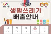 (포탈뉴스통신) 충남 서산시는 설 명절을 맞아 귀성객과 시민들이 쾌적하게 명절을 보낼 수 있도록 “설 명절 쓰레기 관리 대책”을 2월 2일부터 18일까지 추진한다고 밝혔다. 시에 따르면 관리 대책으로 추진되는 사항은 ▲설맞이 환경정화활동 ▲설 연휴 생활 쓰레기 수거 및 일정 안내 ▲환경종합상황실·기동처리반 운영 등이다. 먼저, 시는 설 명절 전 깨끗한 도시 환경을 조성하기 위해 2월 13일까지 공직자, 지역사회 기관·단체와 함께 관내 전 지역을 청소하는 ‘설맞이 환경정화활동’을 추진한다. 이번 대청소는 귀성객에게 쾌적한 귀성길과 생활 환경을 제공하기 위해 관내 도로변과 유동 인구가 많은 지역을 중심으로 진행된다. 설 연휴 쓰레기 수거 일정은 2월 17일부터 18일까지 2일간은 생활 쓰레기가 수거되지 않으며, 그 밖의 기간에는 정상적으로 수거될 예정이다. 연휴 기간 시민들은 2월 16일과 17일을 제외한 기간에 저녁 8시 이후부터 기존 배출 장소에 생활 쓰레기를 배출하면 된다. 시는 설연휴 생활 쓰레기 수거 일정을 2월 13일까지 서산시 누리집, 중앙호수공원 전광판, 서산시