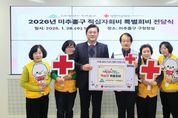 (포탈뉴스통신) 인천 미추홀구는 28일 구청장실에서 대한적십자사 인천지사(회장 조의영)와 적십자봉사회 미추홀구협의회(회장 조혜정) 등이 참석한 가운데 적십자 특별회비 200만 원을 전달했다. 이날 전달된 특별회비를 포함한 적십자회비는 재난 발생 시 이재민 구호 활동, 취약계층 및 복지 사각지대 위기가정 지원 등 각종 인도주의 활동에 사용될 예정이다. 이영훈 구청장은 “지역 곳곳의 소외된 이웃에게 희망을 전하는 의미 있는 일에 동참할 수 있어서 기쁘다.”라며, “지역사회에 따뜻한 기부 문화가 널리 퍼질 수 있도록 함께 노력하겠다.”라고 말했다. 한편, 구는 매년 지역사회 소외계층을 돕기 위해 적십자 특별회비 납부에 동참하고 있으며 이를 통해 지역 내 어려운 이웃들에게 실질적인 도움을 주고 있다. [뉴스출처 : 인천시 미추홀구]