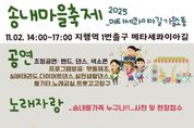 (포탈뉴스통신) 동두천시 송내동 주민자치위원회는 오는 11월 2일 오후 2시부터 지행역 1번 출구 메타세콰이아길에서 ‘2025 송내마을축제’를 개최한다고 밝혔다. 이번 축제는 주민자치센터 프로그램 수강생을 비롯해 지역 학교, 동아리, 학원 등 다양한 주민이 참여해 주민자치 활성화와 지역 문화·예술 교류의 장을 마련하고자 기획됐다. 행사 당일에는 송내동 주민 노래자랑, 주민자치 프로그램 발표회·전시회, 초청공연, 체험부스, 벼룩시장, 먹거리 마당 등 다채로운 프로그램이 진행된다. 특히 주민이 직접 참여하는 노래자랑과 맷돌체조, 트롯고고장구, 실버태권도 등 7개 팀의 프로그램 발표회가 마련돼, 지역 주민들이 그동안 갈고닦은 실력을 선보일 예정이다. 또한 도자기 만들기, 팽이 꾸미기, 만년도장 만들기 등 가족 단위로 즐길 수 있는 체험부스도 함께 운영된다. 이번 축제는 송내동 주민의 화합과 자긍심을 높이는 것은 물론, 주민자치센터 프로그램 홍보와 신규 수강생 유치에도 도움이 될 것으로 기대된다. 아울러 지역 소상공인과 시민이 함께 참여하는 벼룩시장도 열려 지역경제 활성화에도 기여할 전망이다. 행사를 주최
