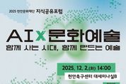 (포탈뉴스통신) 천안문화재단은 내달 2일 천안축구센터에서 ‘2025 천안문화재단 지식공유포럼’을 개최한다고 6일 밝혔다. 이번 포럼은 ‘AI✕문화예술 : 함께 사는 시대, 함께 만드는 예술’을 주제로 인공지능(AI)의 급속한 발전이 우리의 삶과 문화예술에 미치는 영향을 살펴보고, 변화하는 환경 속에서 예술의 새로운 방향을 모색하기 위해 마련됐다. 포럼 1부에서는 김윤경 한국문화관광연구원 부연구위원이 ‘AI시대 문화예술계 변화와 현장 대응 전략’을, 김지현 중부대학교 사진영상학과 교수가 ‘예술가의 AI 창작 실험 및 제작 사례’를 주제로 발제한다. 이어 2부에서는 허대찬 미디어문화예술채널 앨리스온 편집장과 이지용 단국대학교 글로벌 K-컬처 인문사회융합인재단 교수, 최수웅 단국대학교 문예창작과 교수가 참여해 ‘AI와 예술의 공존’에 대해 토론을 진행할 예정이다. 이번 포럼을 통해 AI 시대의 예술 창작과 유통·향유 방식의 변화를 살피고, 지역 문화생태계의 미래 방향을 고민하는 자리가 될 것으로 기대하고 있다. 포럼은 무료로 진행되며, 참가를 희망하는 시민은 재단 누리집 또는 네이버폼을 통해