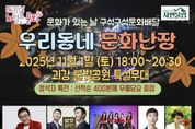 (포탈뉴스통신) 충북 괴산군은 ‘문화가 있는 날’ 주간을 맞아 오는 11월 1일 오후 6시부터 괴강불빛공원 특설무대에서 ‘문화가 있는 날 구석구석 문화배달 '우리동네 문화난장'’ 8회차 행사를 개최한다고 밝혔다. 이번 공연은 올해 마지막으로 진행되는 '우리동네 문화난장' 행사로, 깊어가는 가을밤 군민들에게 흥겨운 문화예술 향연을 선사할 예정이다. 특히 ‘내 나이가 어때서’로 널리 알려진 트로트 가수 오승근을 비롯해 쌍둥이 개그맨에서 트로트 가수로 활동 중인 상호·상민, 퓨전국악밴드 케이소리, 괴산군 홍보대사 가수 강민과 신명화, 그리고 괴산읍두레풍장놀이패의 전통놀이 공연까지 다채로운 무대가 펼쳐질 예정이다. 군은 올해 4월 괴산시장을 시작으로 청안, 칠성, 덕평, 소수 등 군내 8개 지역에서 '우리동네 문화난장'을 운영하며 전통시장, 체육관, 공원 등에서 품바, 비보이, 마술, 주민노래자랑 등 다채로운 공연을 통해 군민들의 큰 호응을 얻었다. 특히 이번 8회차는 2025년 마지막 공연인 만큼, 군은 현장을 찾은 군민들을 위해 선착순 400명에게 무릎담요를 증정할 예정이다. 김춘수 괴산문