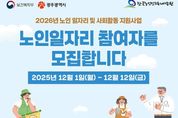 (포탈뉴스통신) 광주광역시는 노인공익활동사업, 노인역량활용사업 등 ‘2026년 노인일자리 사업’ 참여자를 12월 1일부터 12일까지 모집한다. 광주시는 2026년 노인일자리사업에 1574억원의 예산을 투입해 3만6440명의 어르신에게 일자리를 제공하며, 5개 자치구와 5개 시니어클럽 등 72개 일자리 수행기관에서 다양한 사업을 추진한다. 모집인원은 사업유형별로 ▲노노케어 등 노인공익활동사업 2만6479명 ▲보육시설보조 등 노인역량활용사업 6038명 ▲매장운영 등 공동체사업단 2754명 ▲민간업체 취업지원(취업알선형) 사업 1169명이다. 모집대상은 광주시 거주 어르신으로, 노인공익활동사업은 65세 이상(일부 60세 이상) 기초연금수급자 등 기준을 충족한 어르신이다. 노인역량활용사업은 65세 이상(일부 60세 이상), 공동체사업단·취업지원(취업알선형)은 60세 이상 어르신이 신청할 수 있다. 단, 국민기초생활보장법의 생계급여 수급자, 국민건강보험 직장가입자, 장기요양보험 등급판정자(1~5등급), 다른 부처 일자리 사업 참여자 등은 모집 대상에서 제외된다. 신청은 신분증·주민등록등본·관련