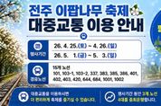 (포탈뉴스통신) 주말을 맞아 이팝나무가 만개한 전주시 팔복동 철길을 찾는 시민들을 위해 전주시내버스가 더 자주 다닌다. 전주시는 오는 25일~26일, 5월 1일~3일 등 총 5일간 팔복예술공장 일대에서 펼쳐지는 ‘2026 전주 이팝나무 축제’에 맞춰 방문객 집중 시기에 시내버스 운행을 조정하는 등 교통수요 중심의 운영 대책을 추진한다고 23일 밝혔다. 시는 올해 4월 벚꽃 개화 시기에 맞춰 만경강변 일대에 특별노선을 운영하는 등 계절별 관광수요에 대응한 교통 지원을 추진했으며, 이러한 운영 경험을 바탕으로 이번 이팝나무 축제 기간에도 교통 운영을 이어갈 계획이다. 이번 축제는 개화 시기에 맞춰 연속 운영이 아닌 주말·공휴일에 집중 운영 방식으로 진행되는 것이 특징으로, 시는 방문객이 몰리는 시기 주말·공휴일 버스 운행을 조정해 5개 노선에 버스 7대를 추가 하는 등 교통 지원을 강화키로 했다. 축제장을 경유하는 전주시내버스 노선은 △101번 △103-1번 △103-2번 △337번 △383번 △385번 △401번 △402번 △403번 △420번 △644번 △684번 △1001번 △1002번으로, 축