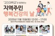 (포탈뉴스통신) 부산 동래구는 오는 11월 15일 낮 12시부터 동래구 혁신어울림센터(동래구 금강로 129) 1층 어울림 마당에서 고신대학교와 함께 ‘지역 주민 행복 건강의 날’ 행사를 개최한다고 밝혔다. 이번 행사는 지역 주민의 건강 증진과 삶의 질 향상을 위해 마련된 것으로, 어린이부터 성인까지 전 연령층이 참여할 수 있다. 혁신어울림센터 행사장 내 각 부스는 체험 내용과 참여 인원에 따라 운영시간이 상이하며, 모든 프로그램은 현장에서 선착순 접수로 참여할 수 있다. 행사에는 고신대학교의 복음병원과 웰니스센터가 참여해 전문적인 건강 체험과 상담 프로그램을 진행한다. 주요 프로그램으로는 △신체 재활 건강 체험(인지 재활치료, 손 기능 평가) △언어·목소리·기억력 검사 △영양판정 및 상담 △기본 건강진단 △탄력밴드 운동 및 테이핑 요법 체험 △어린이 청진기 만들기 체험 등이 운영될 예정이다. 동래구 관계자는“이번 행사는 주민들이 쉽고 즐겁게 건강을 점검하고, 일상 속 건강관리 습관을 기르는 데 도움을 드리기 위해 준비했다”라며 “고신대학교와의 협력을 통해 전문성과 신뢰도를 높인 만큼 주