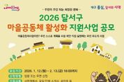 (포탈뉴스통신) 대구 달서구는 주민이 스스로 마을에 필요한 사업을 발굴하고 실행하는 ‘2026년 마을공동체 활성화 지원사업’ 참여자를 2월 13일까지 모집한다. 올해로 7년째를 맞는 달서구 마을공동체 활성화 지원사업은 2020년부터 현재까지 총 79건의 사업을 지원해 왔으며, 탄소중립 실천, 공동텃밭, 공동육아, 소외계층 돌봄, 마을축제 등 다양한 분야에서 주민 주도의 마을문제 해결과 공동체 기반 확충에 기여하고 있다. 이번 공모는 총 3개 분야로 15개팀 내외를 선정해 공동체 역량과 사업 성격에 따라 단계별로 사업비를 지원한다. 지원 규모는 ▲ 신규 공동체를 위한 ‘신참마을’ 200만원 이내 ▲ 경험 있는 공동체를 위한 ‘도약마을’ 300만원 이내 ▲ 마을축제 등을 위한 ‘주민화합행사’ 500만원 이내이다. 신청 자격은 5인 이상 달서구 주민 모임 또는 단체이며, ‘주민화합행사’는 10인 이상이 참여해야 한다. 또한 교육·환경·복지·안전·문화 등 마을에 필요한 다양한 분야에서 다수 주민이 공감하고 함께 참여할 수 있는 공익성 사업이어야 한다. 신청 서식과 자세한 사항은