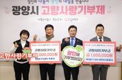 (포탈뉴스통신) 광양시는 6일 광양시청에서 광양 출신 향우 2명이 고향에 대한 애정과 응원의 마음을 전하는 ‘고향사랑기부금 전달식’을 개최했다고 밝혔다. 이날 전달식에는 미라클YT펌프 원영태 대표와 광양본가기정떡 박용무 대표가 참석해 각 100만 원씩 총 200만 원의 고향사랑기부금을 시에 전달했다. 이번 기부는 지방재정 확충과 지역경제 활성화를 목적으로 추진되고 있는 고향사랑기부제의 취지에 공감한 기부자들이 자발적으로 참여해 더욱 의미를 더했다. 특히 원영태 대표는 3년 연속으로 고향사랑기부제에 동참하며 꾸준한 기부 실천을 통해 지역 사랑과 나눔 문화 확산에 앞장서고 있다. 원영태 대표는 “고향 광양에 대한 마음을 담아 지역 발전에 조금이나마 보탬이 되고자 참여했다”며 “이번 기부가 고향사랑기부제의 취지를 널리 알리고, 더 많은 시민과 향우의 참여로 이어지는 계기가 되길 바란다”고 말했다. 박용무 대표는 “지역과 함께 성장해 온 만큼, 앞으로도 지역과 상생할 수 있는 다양한 방법을 지속적으로 고민하겠다”고 밝혔다. 광양시 관계자는 “광양 발전을 위해 늘 아낌없는 응원과 지