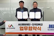 (포탈뉴스통신) 서산문화재단은 지난 12월 단국대학교 정책경영대학원과 상호 협력체계 구축과 교류 확대를 통한 공동 발전을 도모하고자 교류협력 협약(MOU)을 체결했다고 밝혔다. 서산문화재단과 단국대학교 정책경영대학원은 이번 협약을 통해 지역 인재 양성과 인프라 교류를 중심으로 문화·정책 분야에서 지속적인 협력 관계를 구축해 나가기로 뜻을 모았다. 협약에 따라 양 기관은 인재 양성을 위한 상호 협력과 관련 분야 발전을 위한 사항들을 적극 추진할 예정이다. 특히 단국대학교 정책경영대학원의 학위과정 및 모집요강 등은 향후 서산문화재단을 통해 함께 홍보될 예정으로, 지역 문화행정과 정책 분야의 전문 인재 발굴에도 긍정적인 효과가 나타날 것으로 기대된다. 아울러 이번 협약에는 서산문화재단 임직원을 대상으로 한 특별장학금 지원 내용이 포함돼, 조직 구성원의 역량 강화와 자기 계발을 적극적으로 뒷받침할 계획이다. 이에 따라 재단 소속 3명이 2026학년도 단국대학교 정책경영대학원 문화예술콘텐츠학과에 합격해 진학을 앞두고 있다. 서산문화재단 임진번 대표이사는 “이번 협약은 재단 직원들의