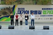 (포탈뉴스통신) 고령군은 11월 8일 오전 9시, 대가야문화누리 야외공연장에서 열린 제13회 대가야왕릉길 걷기대회를 성황리에 마무리했다고 밝혔다. 이번 행사는 대가야, 신규 ‘고도(古都) 지정을 기념하여 개최됐으며 찬란한 역사이자 세계유산에 빛나는 고령 지산동 고분군을 배경으로, 군민과 방문객 등 약 1,000여명이 함께 소통하고 화합하며 가을의 정취를 만끽하는 특별한 시간을 가졌다. 참가자들은 대가야문화누리 야외공연장을 출발해 대가야역사테마관광지를 거쳐, 유네스코 세계유산인 지산동 고분군을 따라 주산으로 내려오는 약 6km의 코스를 완주했다. 아름다운 왕릉길 경관을 따라 걸으며 청명한 가을 날씨 속에서 건강과 활력을 되찾는 뜻깊은 시간을 보냈다며 높은 만족감을 표했다. 이번 대회는 단순한 걷기대회에 그치지 않고, 다양한 체험 부스와 공연으로 더욱 풍성한 즐길거리를 제공했다. 고령군 여성단체협의회와 자원봉사센터가가 운영한 먹거리 부스, 고령소방서의 안전체험부스, 고령군보건소의 건강UP체험부스는 참가자들의 큰 호응을 얻었다. 또한, 많은 사랑을 받고 있는 가수 김소유와 윤서령의 축하공연은 현장의 분위기를 한층 고조시켰으며,