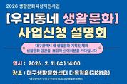 (포탈뉴스통신) 대구문화예술진흥원은 2월 13일부터 3월 6일까지 2026 생활문화육성지원사업 '우리동네 생활문화'에 참여할 생활문화 공간 및 연계 기획단체를 공개 모집한다. ‘우리동네 생활문화’는 지역 내 새로운 생활문화 공간을 발굴하고, 생활문화 기획 프로그램 운영을 통해 커뮤니티 기반 생활문화 공간 조성을 지원하는 사업이다. 올해는 대구 전 지역을 대상으로 신규 생활문화 공간 발굴과 함께 생활문화 활동이 부족한 권역(계층·지역)의 활성화 및 지속 가능한 공동체 육성에 중점을 두고 운영된다. 공모 대상은 대구에 소재한 생활문화 활동이 가능한 공간과 생활문화 기획 역량을 갖춘 단체(문화콘텐츠 관련 예술가·기획자·활동가 등으로 구성된 단체)가 연계된 단체가 대상이다. 올해는 총 10개 내외의 단체를 선정할 예정이며 선정된 단체에는 단체당 550만 원의 사업비 지원과 함께 ‘우리동네 생활문화 지도’ 플랫폼 내 통합 홍보 등을 지원할 예정이다. 공모에 앞서 2월 11일 14시, 대구생활문화센터에서 사업설명회가 진행되며, 사업 신청은 2월 13일부터 3월 6일까지 국가문화예술지원시스템을 통