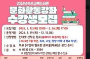 (포탈뉴스통신) 속초교육도서관은 관내 학생 및 학부모·지역주민들의 지속 가능한 배움을 통한 자기성장을 위해 ‘2026년 문화활동강좌’ 수강생을 모집한다. 이번 강좌는 3월 19일부터 12월 12일까지 운영되며, 초등학생 대상 △어린이 글로 표현하는 세상 등 7개 강좌, 중·고등학생 대상 △핵심을 잡아주는 고등논술 등 2개 강좌, 학부모·지역주민 대상 △포토샵 자격증반 등 5개 강좌로 총 14개 프로그램이 운영된다. 수강 신청은 2월 12일부터 2월 26일까지 속초교육도서관 누리집을 통해 신청 가능하며, 스마트폰 활용교육 강좌는 방문을 통해 선착순으로 신청할 수 있다. 김주희 관장은 “지역주민 누구나 학습을 통해 배우고 성장할 수 있도록 평생교육의 기회를 지속적으로 확대·지원할 것이다.”라고 전했다. 자세한 내용은 속초교육도서관 누리집 공지사항을 참고 하거나 담당자에게 문의하면 된다. [뉴스출처 : 강원특별자치도교육청]