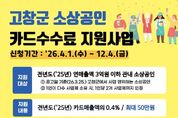 (포탈뉴스통신) 고창군이 관내 소상공인의 경영 부담 완화를 위해 오는 4월1일부터 예산 소진 시까지 ‘2026년 소상공인 카드수수료 지원사업’을 본격 추진한다고 밝혔다. 이번 사업은 전년도 연매출 3억원 이하 고창군 소재 소상공인을 대상으로 하며, 카드 매출액의 0.4%에 해당하는 카드수수료를 최대 50만원까지 지원한다. 특히, 해당 사업은 도비와 군비를 포함해 업체당 최대 30만원까지 지원되는 가운데, 고창군은 군비 20만원을 추가로 투입해 도내 타 시·군보다 확대된 최대 50만원까지 지원한다. 최근 중동 정세 등 대외 경제 불안에 따른 경기 침체와 소비 위축으로 어려움을 겪는 지역 소상공인의 경영 여건을 고려해 전년보다 1개월 앞당겨 조기 시행하며, 실질적인 경영 부담 완화에 중점을 두었다. 신청을 희망하는 소상공인은 사업장 소재지 읍·면 주민행복센터를 방문해 신청할 수 있으며, 자세한 사항은 고창군청 홈페이지 공고문을 통해 확인할 수 있다. 고창군수는 “소상공인은 지역경제의 근간이고, 이들의 회복이 곧 지역의 활력이다”며, “이번 지원사업이 경기침체로 어려움을 겪는 소상공인들에게