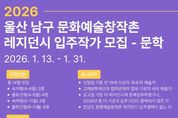 (포탈뉴스통신) 고래문화재단이 운영하는 울산 남구 문화예술창작촌이 2026년도 레지던시 사업에 참여할 입주작가를 1월 13일부터 1월 31일까지 공개 모집한다. 공개모집 분야는 문학, 시각·예술 2개 분야로 문학 분야는 장생포 아트스테이에서 시, 소설, 아동문학, 희곡, 수필 등 다양한 장르의 작가 총 14명에게 4월부터 3개월 단위로 운영한다. 시각예술 분야는 창작스튜디오 131에서 회화, 조각, 사진, 설치, 미디어 등 장르의 예술가 3명에게 3월부터 11월까지 9개월간 작업실과 프로그램 연계 혜택을 지원하게 된다. 특히 올해 문학 분야는 지역에 새로운 문학적 시선을 유입하고 차세대 작가들의 성장 기반을 마련하고자 예비·신진 작가 중심의 모집을 통해 더 많은 청년 창작자들이 창작 활동을 시작하고 지속할 수 있도록 지원 폭을 확대할 예정이다. 고래문화재단은 추후 서류 검토와 인터뷰 심사를 거쳐 최종 입주작가를 선정할 계획이며 선정된 예술가에게는 작업실 제공과 함께 창작지원금, 워크숍 등의 혜택이 주어진다. 모집 접수는 1월 31일 토요일 오후 5시까지 진행되며 신청 서류는 ‘울산 남