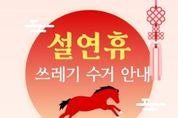 (포탈뉴스통신) 고양특례시 일산서구는 설 연휴 기간 주민 불편을 최소화하고 쾌적한 도시환경을 유지하기 위해 오는 14일부터 18일까지 5일간 생활폐기물 관리대책을 추진한다. 구는 ▲비상근무체계를 통한 신속한 청소행정 서비스 제공 ▲재활용품 분리배출·생활폐기물 감량 홍보 ▲연휴 기간 수거일 사전 안내 등을 실시해 올바른 쓰레기 배출을 유도할 방침이다. 이달 14일과 18일을 집중 수거일로 지정해 생활폐기물과 음식물 관련 폐기물을 정상 수거하고, 설 연휴 기간인 2월 15일부터 17일까지는 수거를 중단한다. 이에 따라 연휴 기간 중 생활쓰레기 배출 자제와 수거 일정 조정사항을 사전 홍보할 계획이다. 또한 연휴 기간, 총 17명 규모의 청소대책 상황반과 대응반을 편성·운영해 생활쓰레기 관련 민원과 무단투기 신고에 신속히 대응하고 쓰레기 투기 상습지역을 중심으로 순찰과 집중 수거를 병행한다. 구 관계자는 “설 연휴에도 주민들이 불편 없이 쾌적한 환경에서 명절을 보낼 수 있도록 청소행정 운영에 최선을 다하겠다”며 “주민들께서도 수거일을 준수하고 올바른 분리배출과 쓰레기 감량에 적극 협조해 주시길 바란다”고